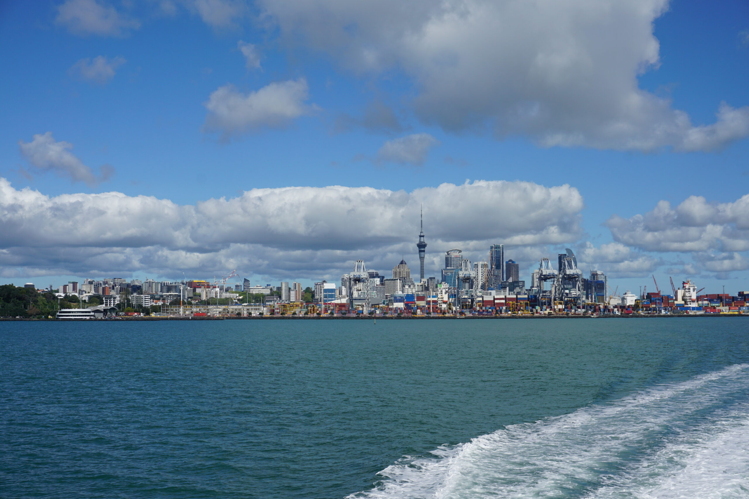 Auckland a távolból – kikőtő, felhőkarcolók